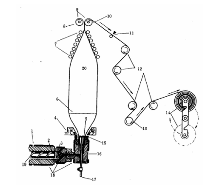 1、擠出料筒 2、過濾網(wǎng) 3、多孔板 4、風(fēng)環(huán) 5、芯模