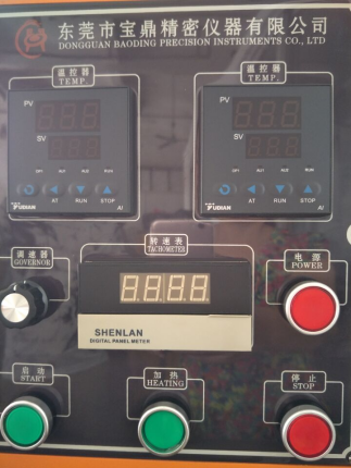 溫控器:顯示和設(shè)定輥筒溫度 停止鍵:停止旋轉(zhuǎn)開關(guān) 電源鍵:電源開關(guān)