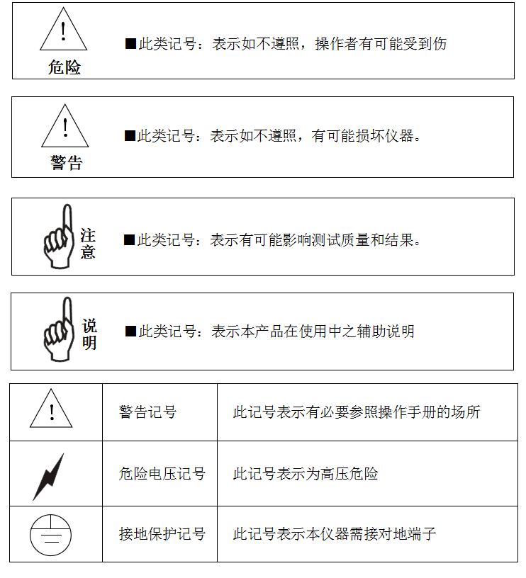 一、關于使用儀器時需注意的事項和防止意外及危險,請您務必遵守下列警告、危險、注意的顯示記號: