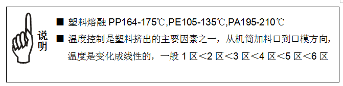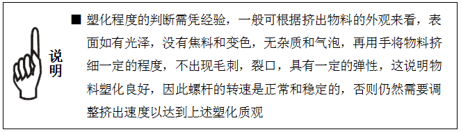 (2)將原料投入料斗,設定擠出壓力后開動螺桿驅(qū)動電機,熔體擠出成制品后,觀察口模出料,其均勻且塑化良好,則表明該溫度和擠出速度是適當?shù)模駝t仍需要調(diào)整各段的溫度和擠出壓力。