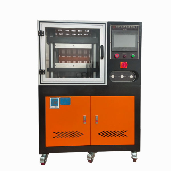 原料放于鑄模內(nèi),夾于本機(jī)電熱平板間加以壓力及溫度,使原料成型,以供試驗(yàn),做為工廠大量生產(chǎn)配料之依據(jù)。本機(jī)裝有PLC程序控制彩色觸摸屏,人機(jī)界面作業(yè)系統(tǒng)可設(shè)定壓力、溫度、時(shí)間和排氣次數(shù),硫化過程實(shí)時(shí)顯示和監(jiān)視,所設(shè)模壓程序全數(shù)自動完成。