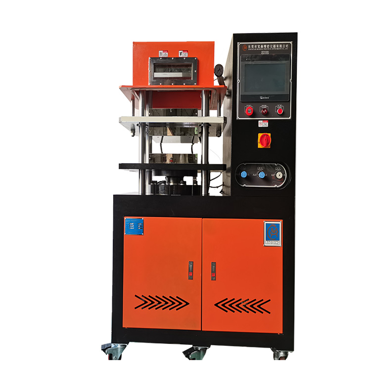 原料放于鑄模內(nèi),夾于本機(jī)電熱平板間加以壓力及溫度,使原料成型,以供試驗(yàn),做為工廠大量生產(chǎn)配料之依據(jù)。本機(jī)裝有PLC程序控制彩色觸摸屏,人機(jī)界面作業(yè)系統(tǒng)可設(shè)定壓力、溫度、時(shí)間和排氣次數(shù),硫化過程即時(shí)顯示和監(jiān)視,所設(shè)模壓程序全數(shù)自動(dòng)完成。